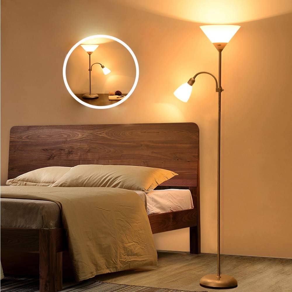 • 【One Lamp Three Use】This standard lamp has two lamps head, the up light can as a floor lamp to light up your room, and the side light can as a reading lamp to provide the suitable light for you when you are reading. What is more, only install 1 pole when you are installing, it also could be a table lamp for you to study.