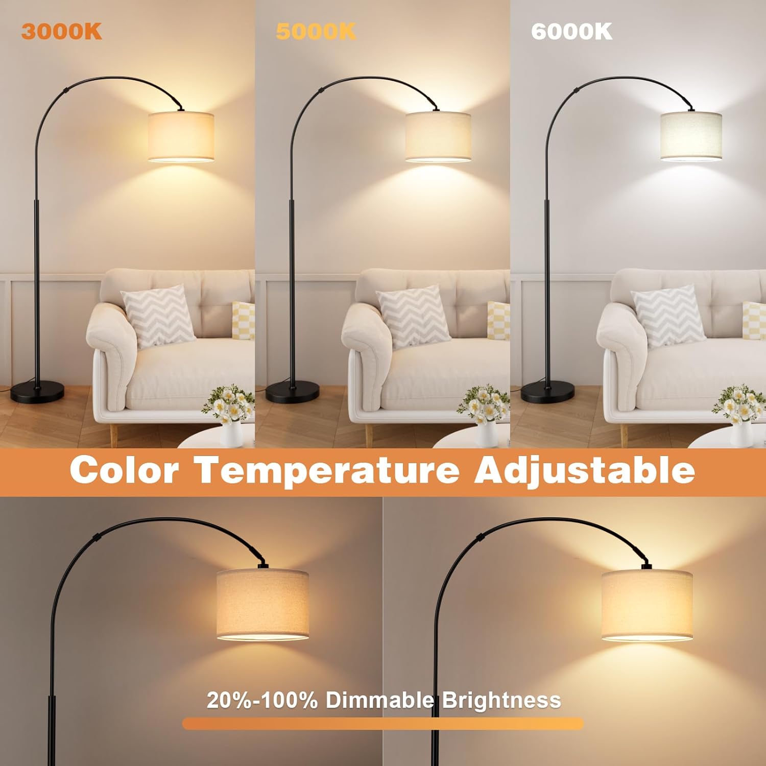 • Modern Standing Lamp with Dimmable 3 Color Temperatures: Experience the perfect lighting with our arch floor lamp, featuring seamless brightness adjustment from 20% to 100%, and three adjustable color temperatures: Warm White 3000K, Natural White 4500K, and Cool White 6000K. Whether you are setting the mood for a cozy evening or need bright, energizing light for your daily activities, this hanging floor lamp is designed to meet all your lighting needs
